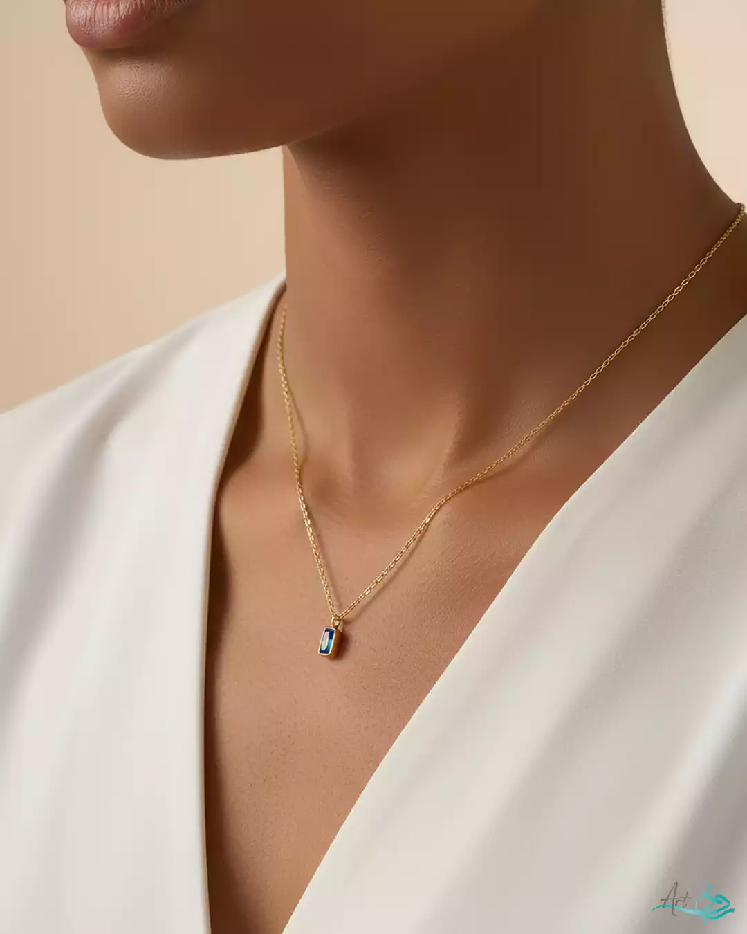«گردنبند طلا تک نگین باگت آبی» با نگین مستطیلی تراش باگت و فریم طلایی براق، هارمونی چشمنوازی از آرامش و لوکس بودن را به استایل شما میآورد. جلوهی مینیمال آن برای هر موقعیتی—from کژوال روزانه تا مهمانی رسمی—مناسب است.
