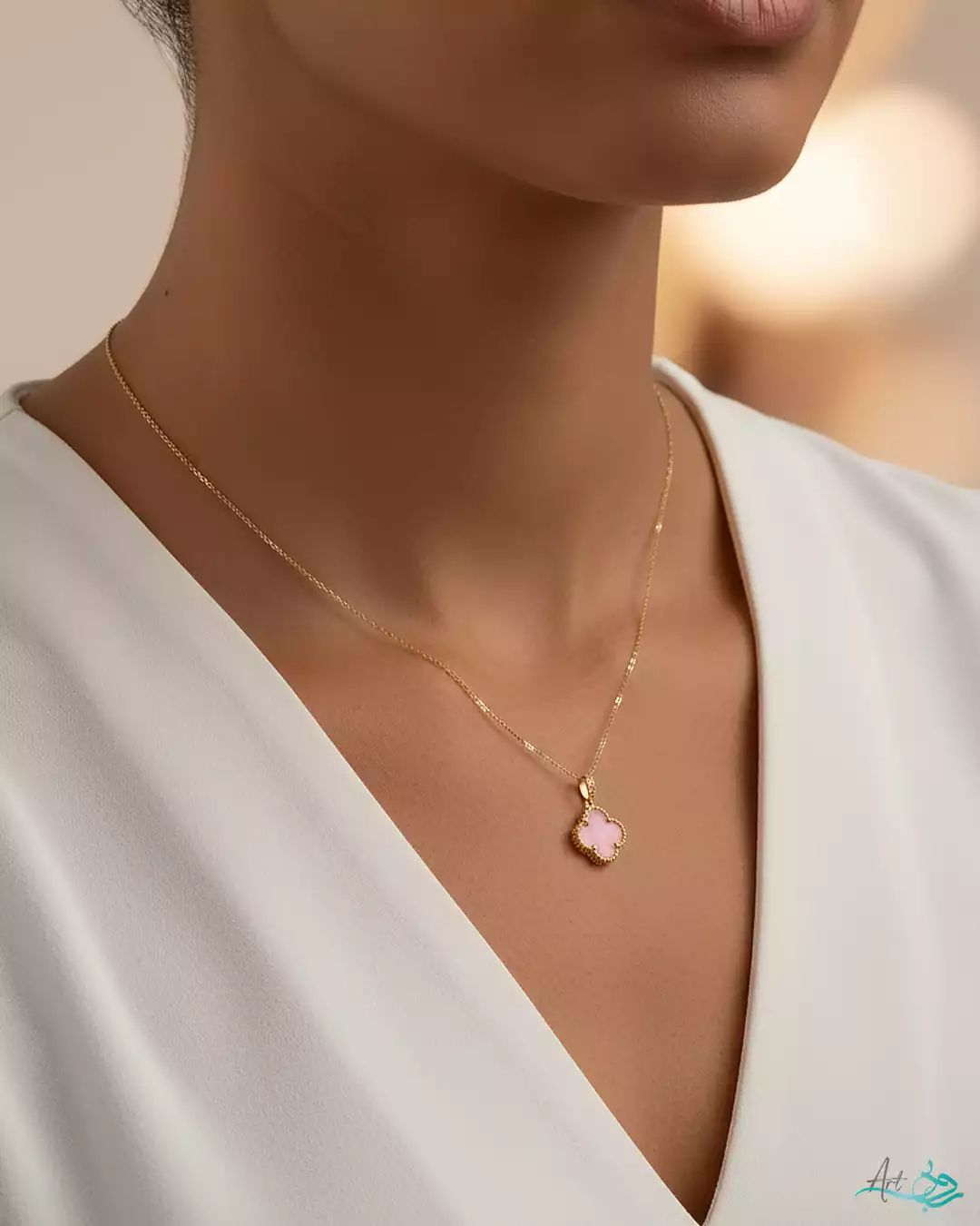 - آویز طلا ونکلیف فلورا با سنگ صدف صورتی سایز متوسط