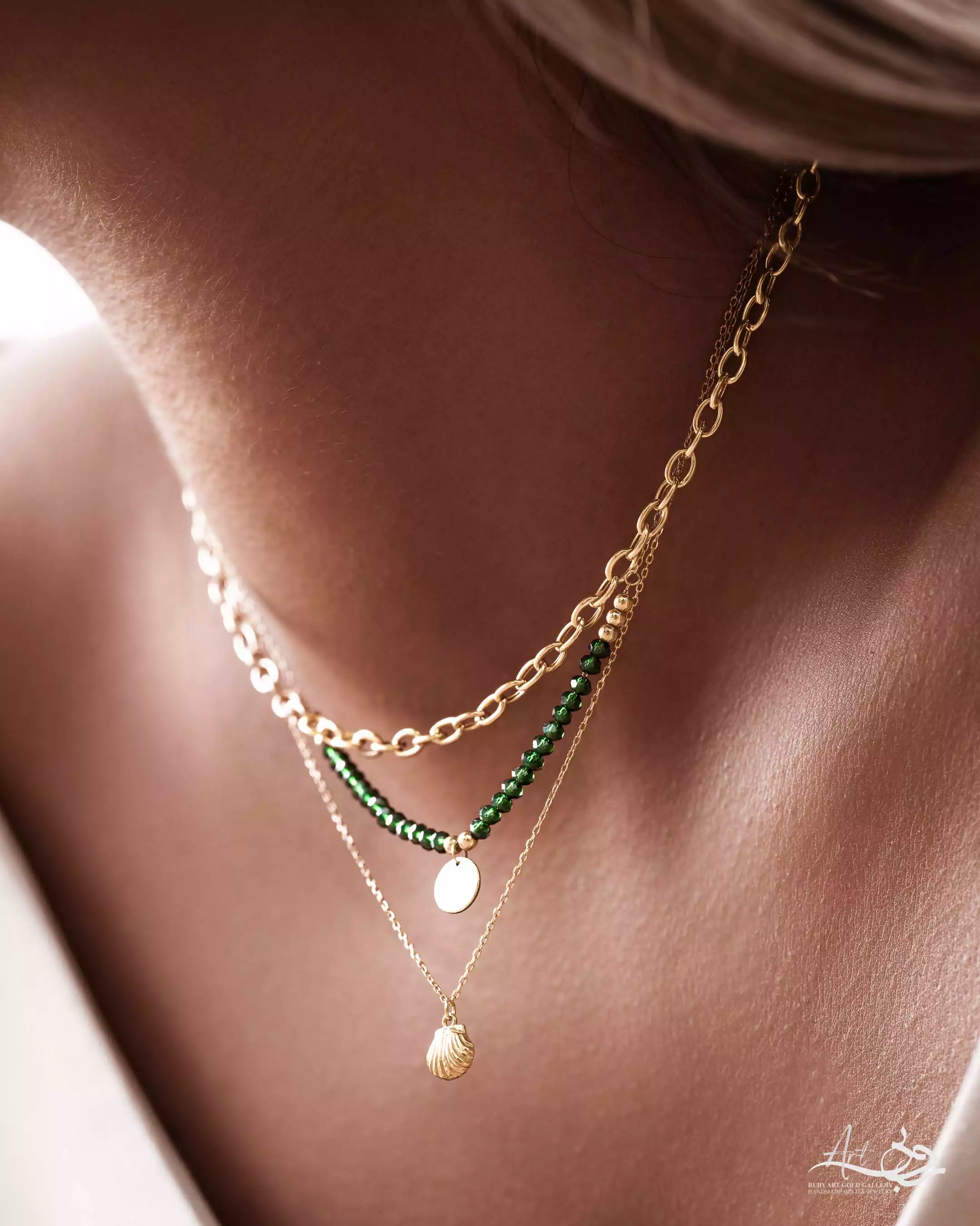 گردنبند طلا پولک با مهره سبز