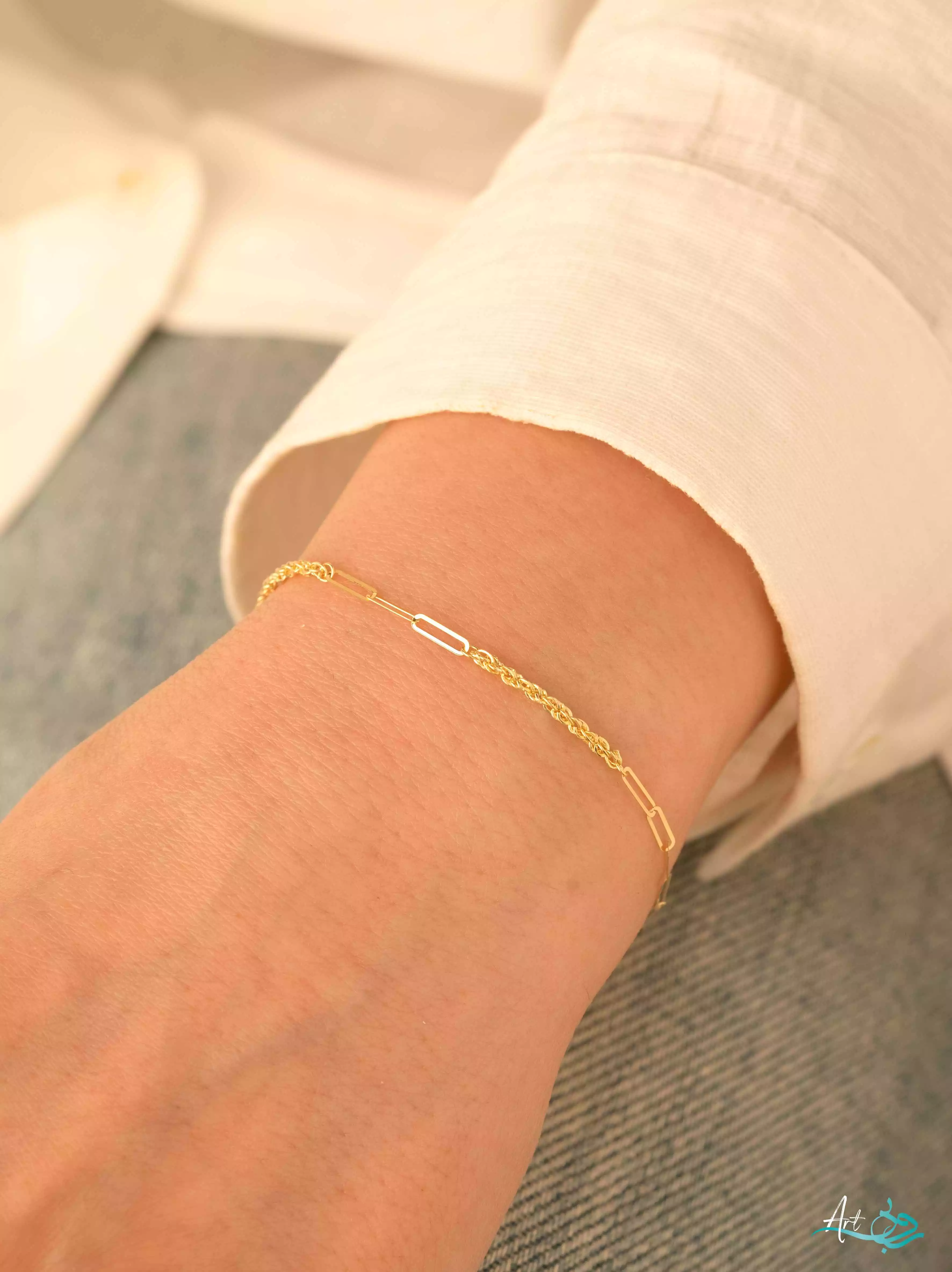دستبند کارن با تناوبِ قطعات دیپلماتِ تراشخورده و لینکهای کشیدهی مستطیلی، انعکاس نور چندوجهی و چشمگیری ایجاد میکند. این ترکیب تمیز و مدرن، هم کنار پوشش روزمره و هم در موقعیتهای رسمی، استایلی شیک و اعتمادبهنفسبخش میسازد.