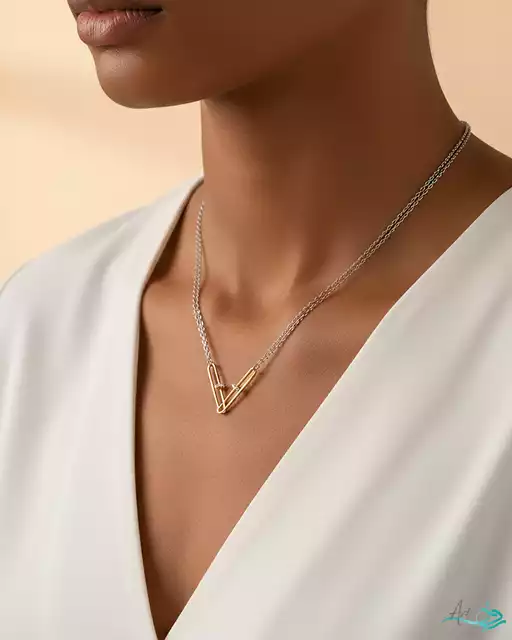 «گردنبند طلا دو رج مینیمال نوا» ترکیبی از زنجیر نقرهای چندلایه و المان طلایی V شکل است که با دو نگین کوچک در دو طرف، جلوهای مدرن و منحصربهفرد دارد. این گردنبند انتخابی عالی برای بانوانیست که به طراحیهای ساختارشکن و مینیمال علاقه دارند.