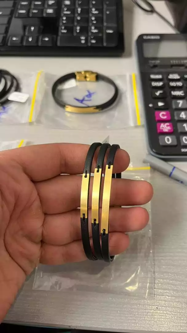 پلاک طلای دستبند ها اغلب با تکنولوژی لیزر کات تولید می شود و با توجه به اینکه این محصولات با چرم ترکیب می شوند دوام و استحکام آنها بالا می باشد .