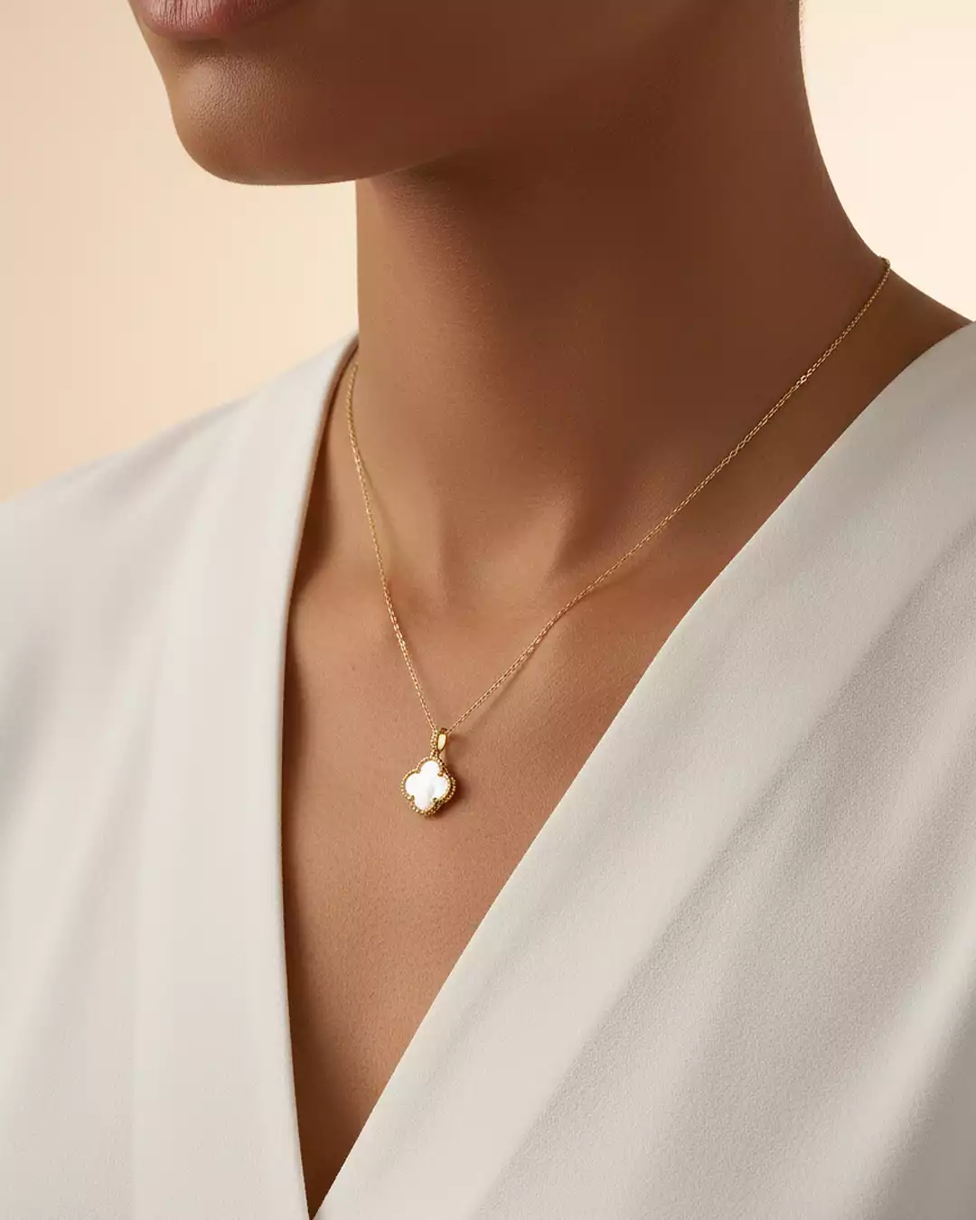 آویز طلا ونکلیف فلورا با سنگ صدف سفید سایز بزرگ